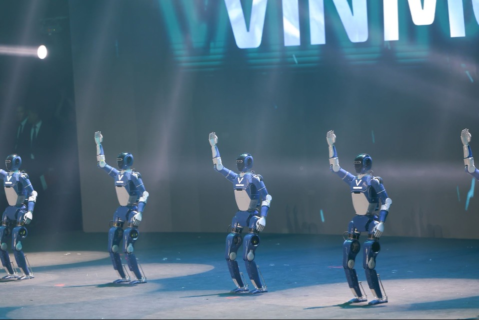 Robot của VinMotion thực hiện các động tác đồng đều trên sân khấu - Ảnh: VinMotion