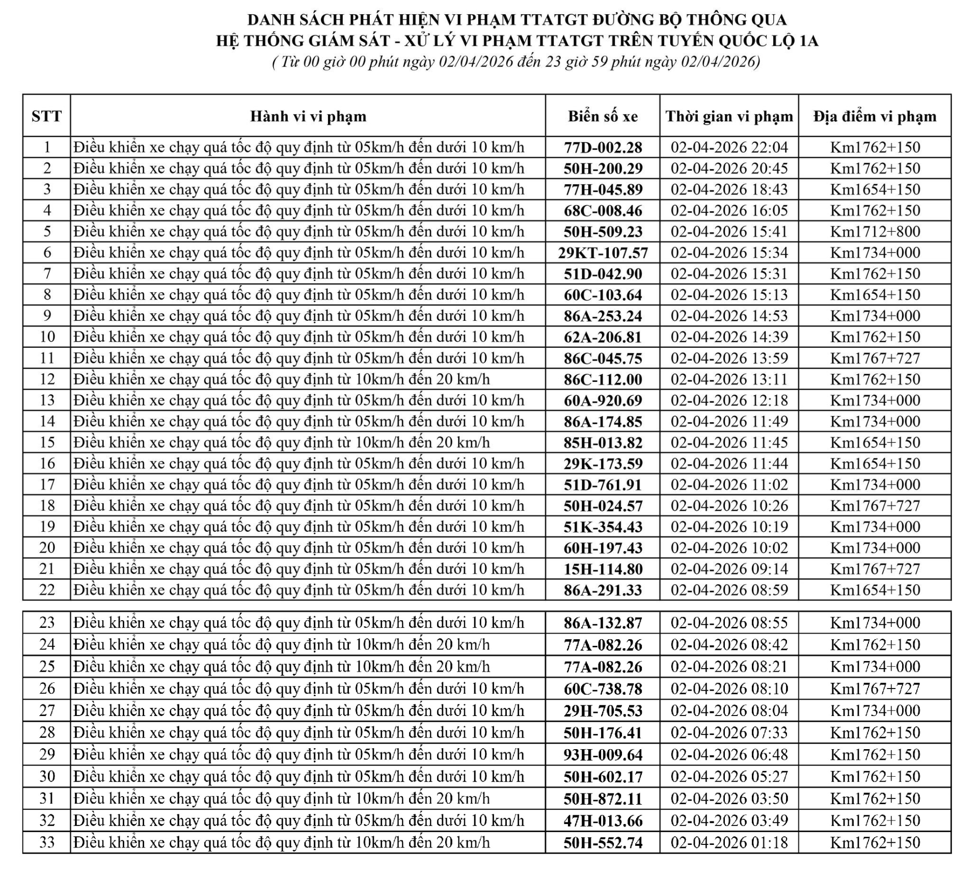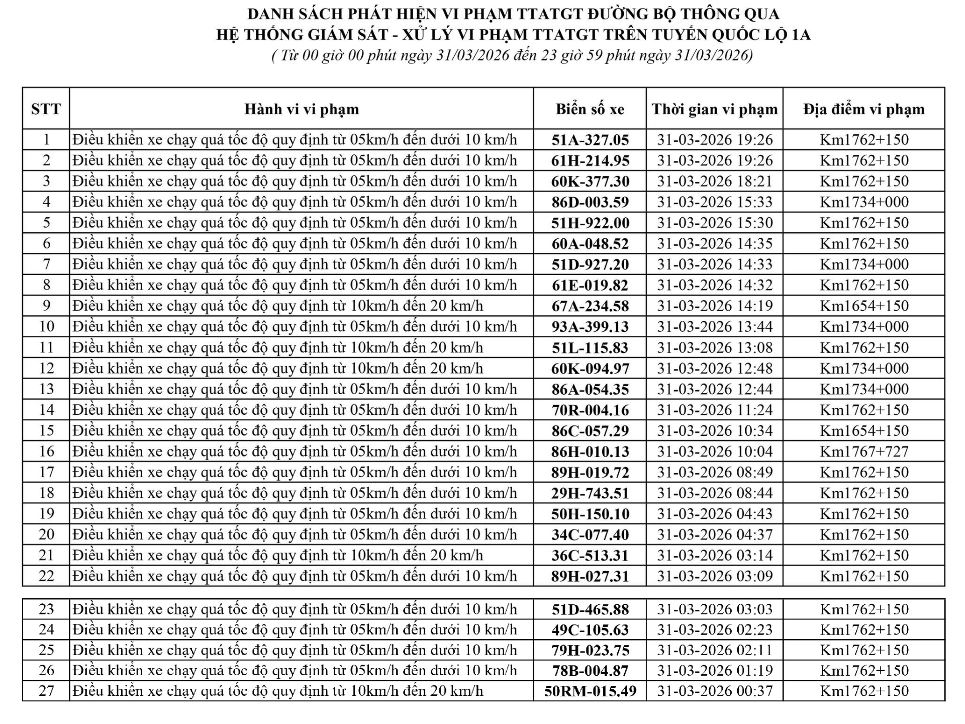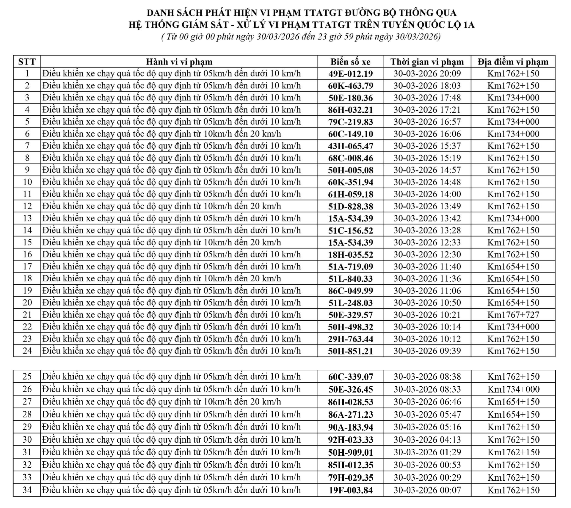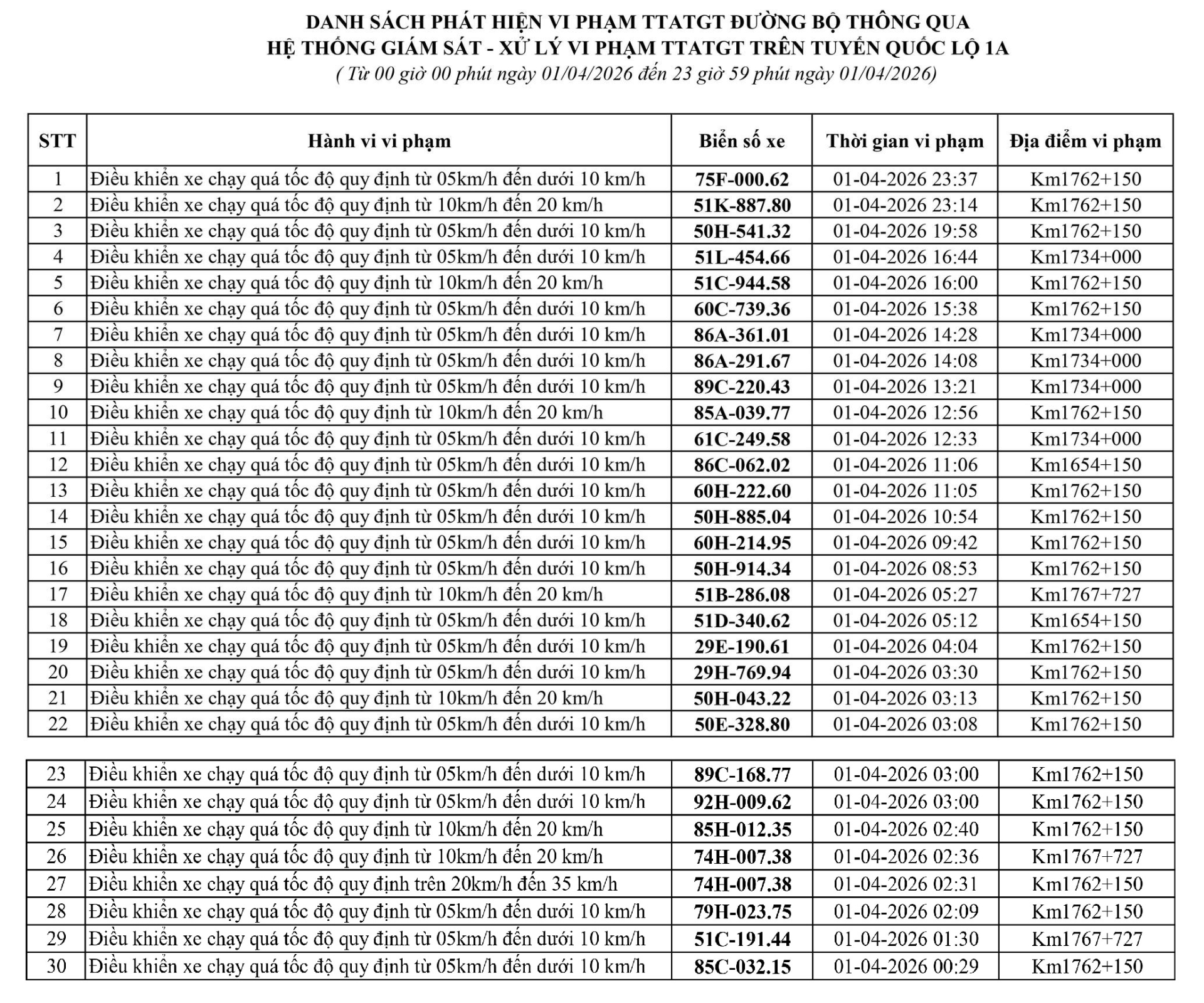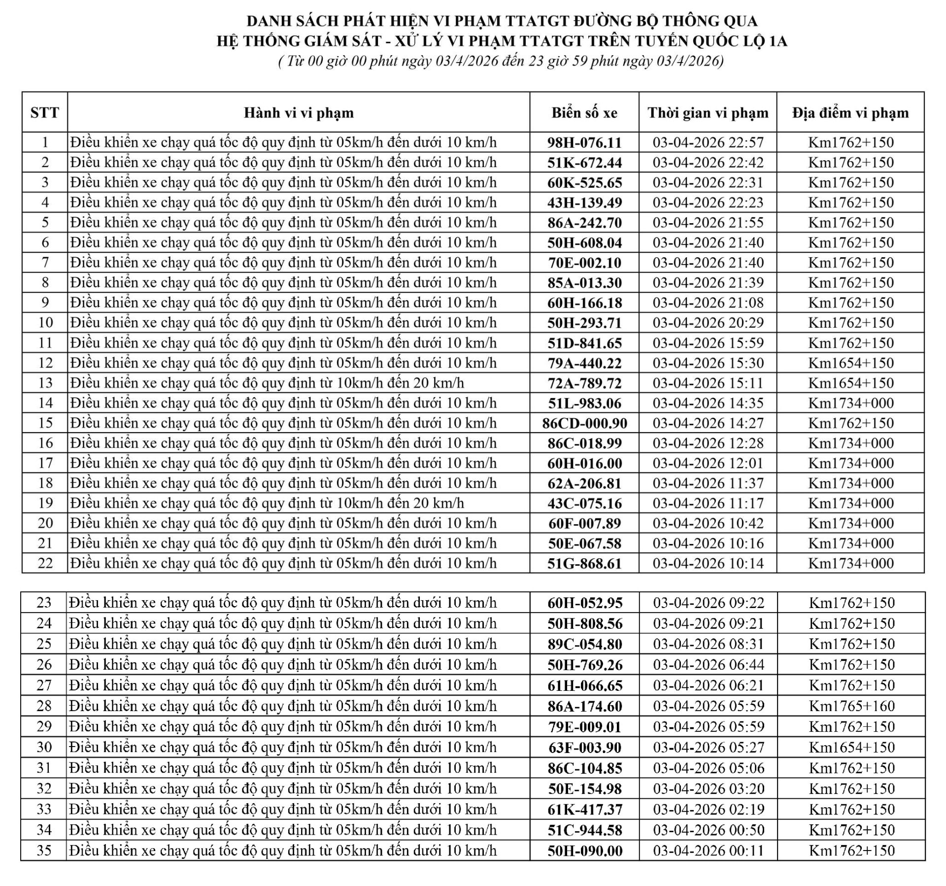 Công an tỉnh Lâm Đồng đã công bố danh sách các phương tiện vi phạm lỗi chạy quá tốc độ trong tuần đầu tháng 4/2026.