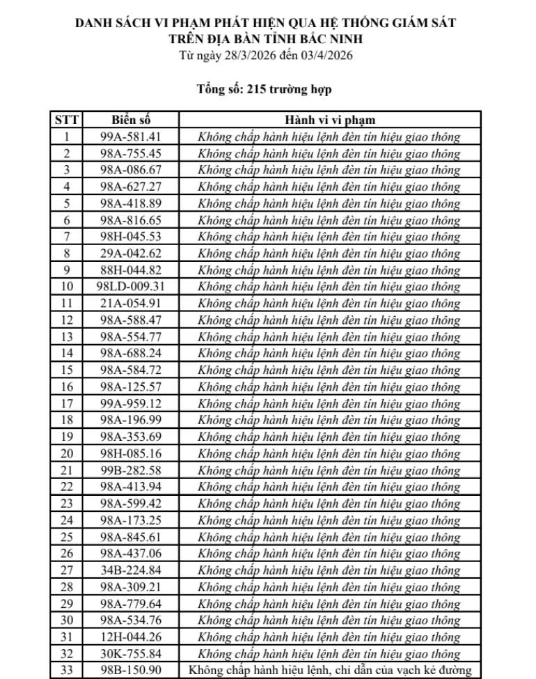 Theo đó, từ ngày 28/3 đến ngày 3/4/2026, Phòng Cảnh sát giao thông Công an tỉnh Bắc Ninh đã ghi nhận nhiều trường hợp vi phạm thông qua hệ thống giám sát.