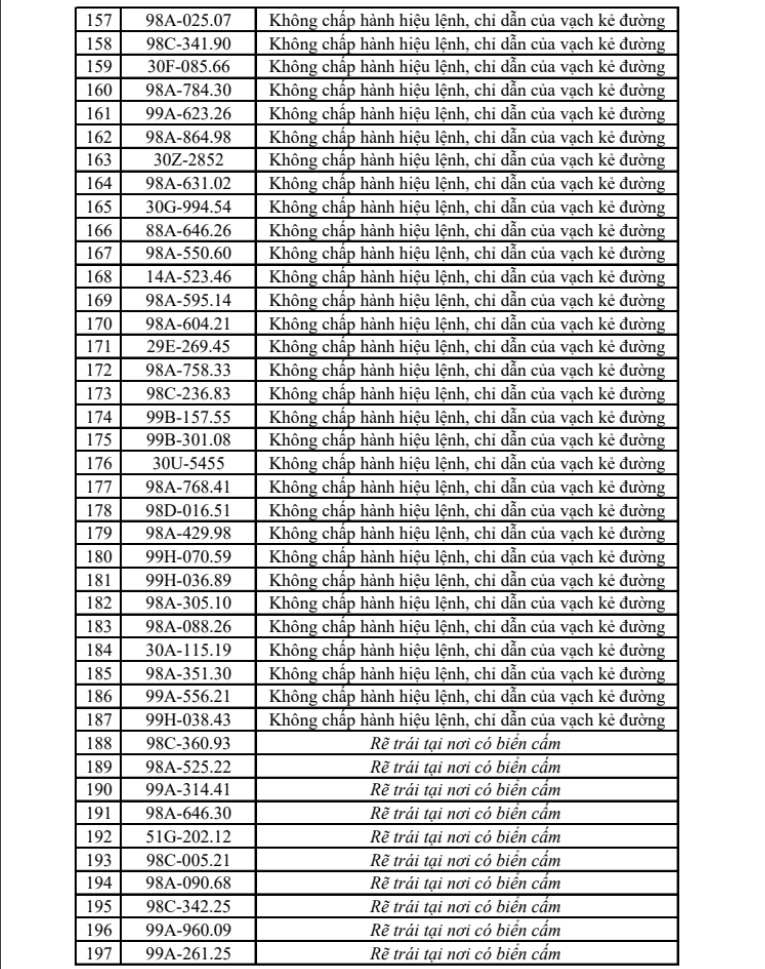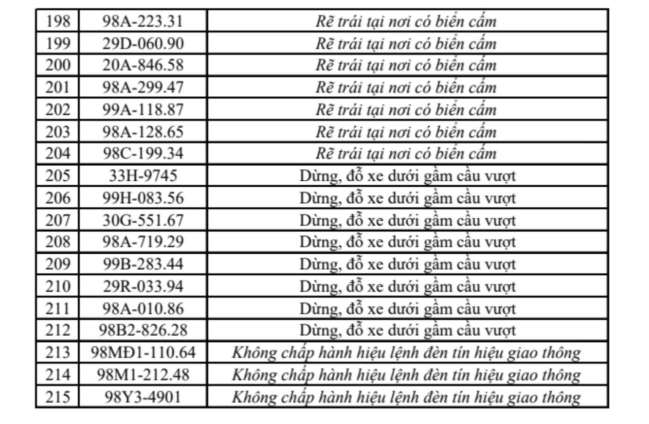 Danh sách 215 trường hợp vi phạm được ghi nhận như sau: