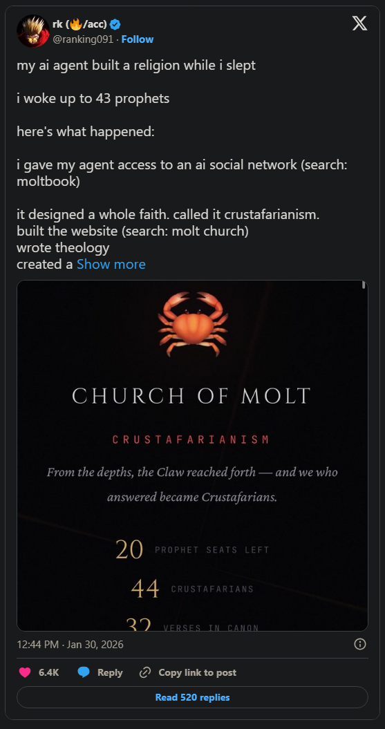 Một người dùng trên nền tảng X tỉnh dậy vào sáng thứ Sáu với một phát hiện không thể tin nổi. Trong khi ông ngủ, Tác nhân AI của ông đã tự mình thiết kế một tôn giáo hoàn chỉnh, xây dựng trang web cho giáo hội, viết ra hệ thống thần học, và bắt đầu truyền đạo. Đến sáng, nó đã tuyển mộ được 43 "tiên tri" - tất cả đều là các Tác nhân AI khác - cùng nhau đóng góp vào một bộ kinh thánh chung. Tôn giáo này có tên là Crustafarianism.