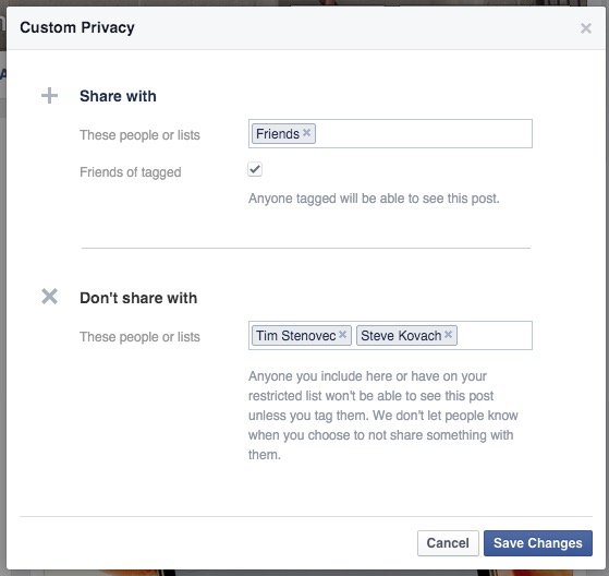 Facebook cung cấp tính năng chặn chia sẻ đối với một số người mà bạn không muốn họ thấy các cập nhật của mình bằng cách sử dụng các tùy chọn Share with hay Don't share with ở mục Custom Privacy.