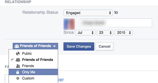 Có nhiều lý do khiến bạn không muốn việc thay đổi quan hệ của mình bị bạn bè biết được. Hiểu được điều đó, Facebook cung cấp các tùy chọn hiển thị chia sẻ thay đổi quan hệ. Bạn có thể không để ai thấy được mình đã thay đổi quan hệ bằng tùy chọn Only Me như hình bên dưới.
