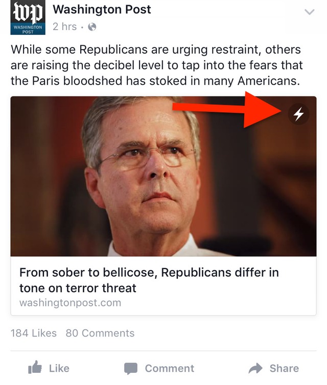 Trên Facebook, một số bài viết được chia sẻ từ 1 trang web khác sẽ xuất hiện biểu tượng hình tia sét ở góc bên phải của ảnh đại diện. Điều đó có nghĩa rằng bạn có thể đọc thông tin này ngay trên Facebook mà không cần phải truy cập liên kết đó. Những liên kết như thế này đang ngày càng tăng lên trên Facebook.