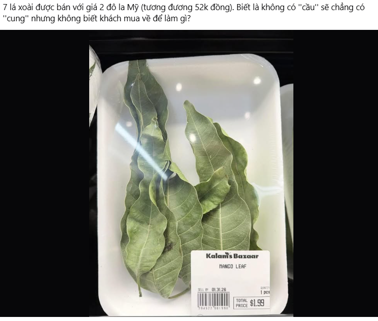 Một khay 7 lá xoài, giá 1,99 USD (khoảng 52.000 đồng), được bọc màng cẩn thận, dán nhãn như một loại thực phẩm chính thống. Nếu ở Việt Nam, lá xoài thường chỉ nằm dưới gốc cây, ít ai để ý. Nhưng tại một cửa hàng thực phẩm Nam Á ở Mỹ, nó lại trở thành món hàng có giá, có mã vạch, có hạn sử dụng.