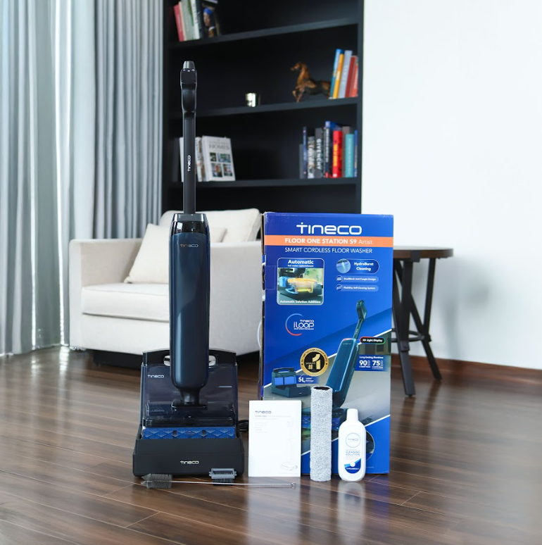 Hướng thứ nhất là tự động hóa toàn bộ vòng lặp dọn dẹp. Đây là thứ Tineco FLOOR ONE STATION S9 Artist đang theo đuổi. Điểm khác biệt cốt lõi không nằm ở thân máy mà nằm ở trạm sạc. Trạm này làm được bốn việc mà trước đây người dùng phải tự làm bằng tay: tự động bơm nước sạch vào máy mỗi khi máy trở về dock, giặt con lăn bằng nước nóng, sấy khô ở 85°C và chứa nước bẩn vào bình riêng. Bình chứa nước sạch dung tích 5 lít, đủ dùng liên tục trong 5 đến 7 ngày mà không cần đổ thêm. Kết quả thực tế là người dùng chỉ cần đổ nước một lần mỗi tuần, toàn bộ phần còn lại máy tự lo.