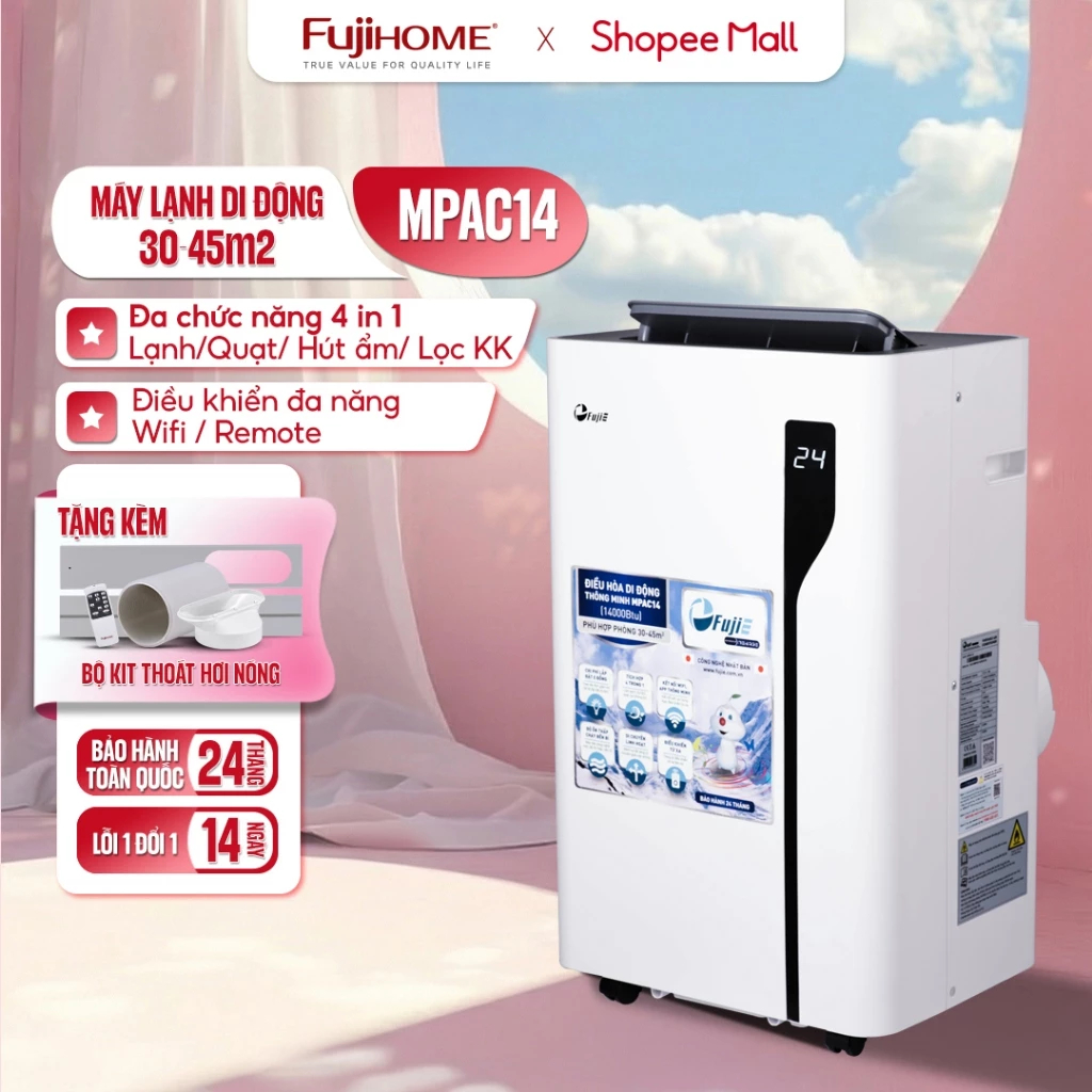 Máy lạnh di động FUJIE MPAC14 công suất 14.000BTU là cứu cánh cho những không gian không thể lắp đặt điều hòa truyền thống. Đây là dạng điều hòa cây một cục, có bánh xe di chuyển linh hoạt giữa các phòng và không đòi hỏi đục tường phức tạp. Máy có khả năng làm mát không khí nhanh chóng, tích hợp điều khiển đa năng và kết nối WIFI để quản lý từ xa qua điện thoại. Sản phẩm đang có giá ưu đãi khoảng 8.568.980đ, phù hợp cho các căn hộ thuê, phòng làm việc nhỏ hoặc những khu vực cần bổ sung luồng khí lạnh tức thì vào những ngày cao điểm nắng nóng.