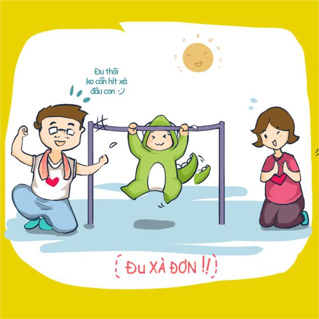 Không phải là “hít xà đơn” mà là “đu xà đơn”, mẹ nhé. Nhiều mẹ ngại cho bé tập xà đơn vì thấy động tác hít xà (cho cằm vượt qua xà) là quá nặng so với sức của bé. Nhưng thật ra, bé chỉ cần bật cao người rồi đu người trên xà thôi là đã kéo giãn toàn thân và rất tốt cho sự phát triển chiều cao của bé rồi.