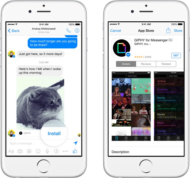 Như đã đề cập trước đây, các ứng dụng như Giphy và ESPN đã được tích hợp trực tiếp vào Messenger. Điều này đồng nghĩa, chúng ta có thể sử dụng Giphy để nhanh chóng chia sẻ một tập tin GIF hoặc chia sẻ các thông tin thể thao và điểm nhấn trận đấu từ ESPN.