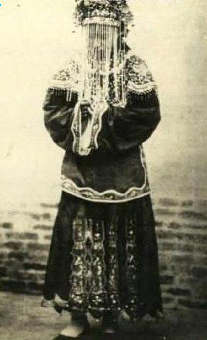 Bên cạnh đó, còn một số hình ảnh trong một đám cưới khác ở thời nhà Thanh. Khác với tiểu thư gia đình quý tộc ở trên, tân nương trong những bức ảnh dưới đây phải đội trên đầu một tấm màn che truyền thống và phải do chính tay tân lang gỡ xuống lúc vào động phòng.