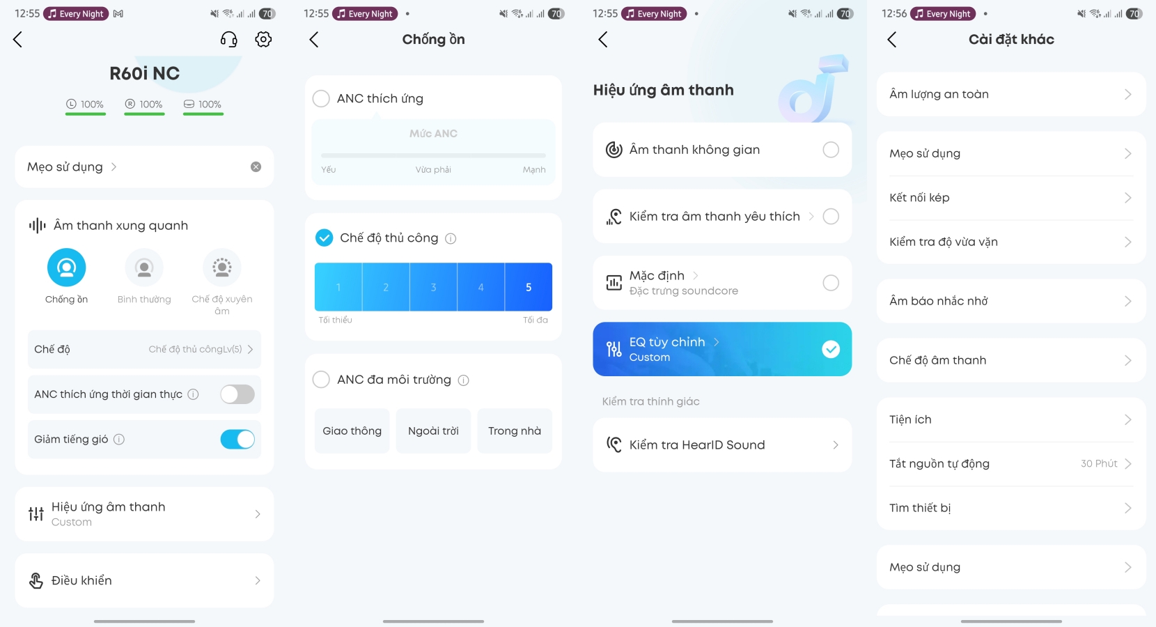 Về chất âm, R60i NC có xu hướng tuning thiên về độ ấm. Dải trầm đánh khá sâu, lực tốt, phù hợp với nhạc điện tử, pop hoặc hip hop. Dải trung được giữ ở mức an toàn, không bị lùi quá nhiều, giọng hát nghe rõ nhưng chưa thật sự tách bạch. Dải cao không quá chói, vừa đủ chi tiết để nghe lâu không mệt tai, nhưng nếu biết chỉnh lại EQ trong app soundcore, độ sáng ở treble cải thiện rõ rệt so với chế độ mặc định.