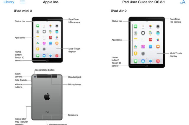 Tuy nhiên, mới đây, Apple đã vô tình tiết lộ thông tin về bộ đôi iPad trên một hướng dẫn sử dụng hai thiết bị trên nền tảng iOS 8.1. Điều đáng nói là những hình ảnh này được tải trực tiếp trong mục giới thiệu của iTunes Store, cho đến giờ vẫn chưa bị gỡ xuống.