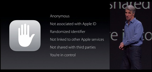 "Tất cả những thứ diễn ra trên thiết bị thì sẽ chỉ nằm trên thiết bị, và dưới sự kiểm soát của người dùng. Và nếu chúng tôi làm một lệnh tìm kiếm dưới sự cho phép của bạn về tình trạng giao thông tại nơi đó, nó sẽ hoàn toàn ẩn danh và không liên kết gì với tài khoản Apple ID hay các dịch vụ nào khác của Apple và cũng không chia sẻ thông tin cho bên thứ 3. Mọi thứ đều trong quyền kiểm soát của bạn", ông giải thích thêm.