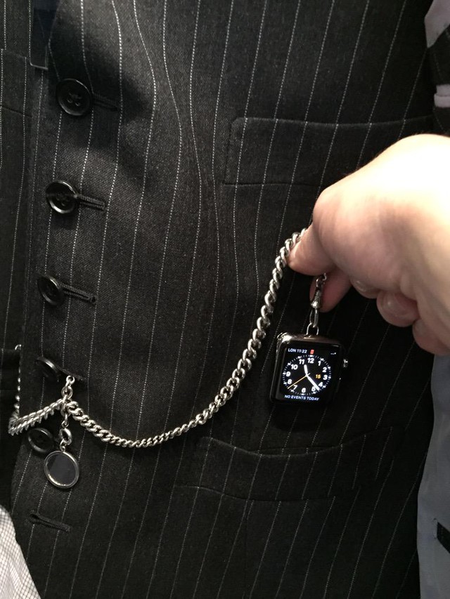 Phóng viên của New York Times đã phát hiện ra phụ kiện đáng chú ý này trong Bộ sưu tập thời trang nam mùa xuân 2016 của Tom Ford ở London. Mặc dù Apple Watch nổi bật ở các tính năng tiện ích như đo nhịp tim hay huyết áp bằng cảm biến khi đeo ở cổ tay, nhưng Ford đã mạo hiểm... nhét nó vào trong túi áo gilet với chuỗi dây dài đậm chất cổ điển.