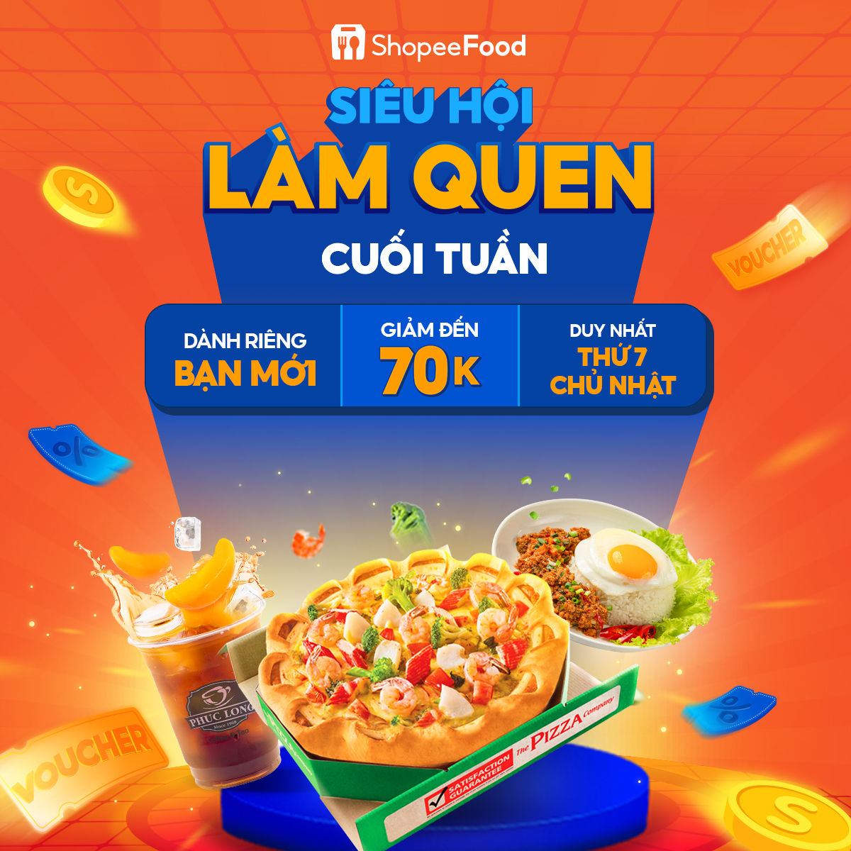 Vẫn chưa hết, như một món quà "kết bạn", Shopee triển khai chương trình "Siêu hội làm quen cuối tuần" dành tặng voucher giảm giá lên đến 70.000 đồng (cho đơn hàng từ 90.000 đồng). Chương trình áp dụng vào thứ Bảy và Chủ Nhật dành riêng cho người dùng mới của Shopee và ShopeeFood. Đặc biệt hơn, voucher giảm giá này áp dụng cho tất cả quán đối tác có mặt trên nền tảng của ShopeeFood. Cuối tuần ở nhà mở tiệc thì đừng quên "quà tặng" siêu hấp dẫn này từ ShopeeFood nha bạn ơi. Tham khảo thông tin chi tiết tại: https://shopee.vn/m/sieu-hoi-lam-quen-weekend