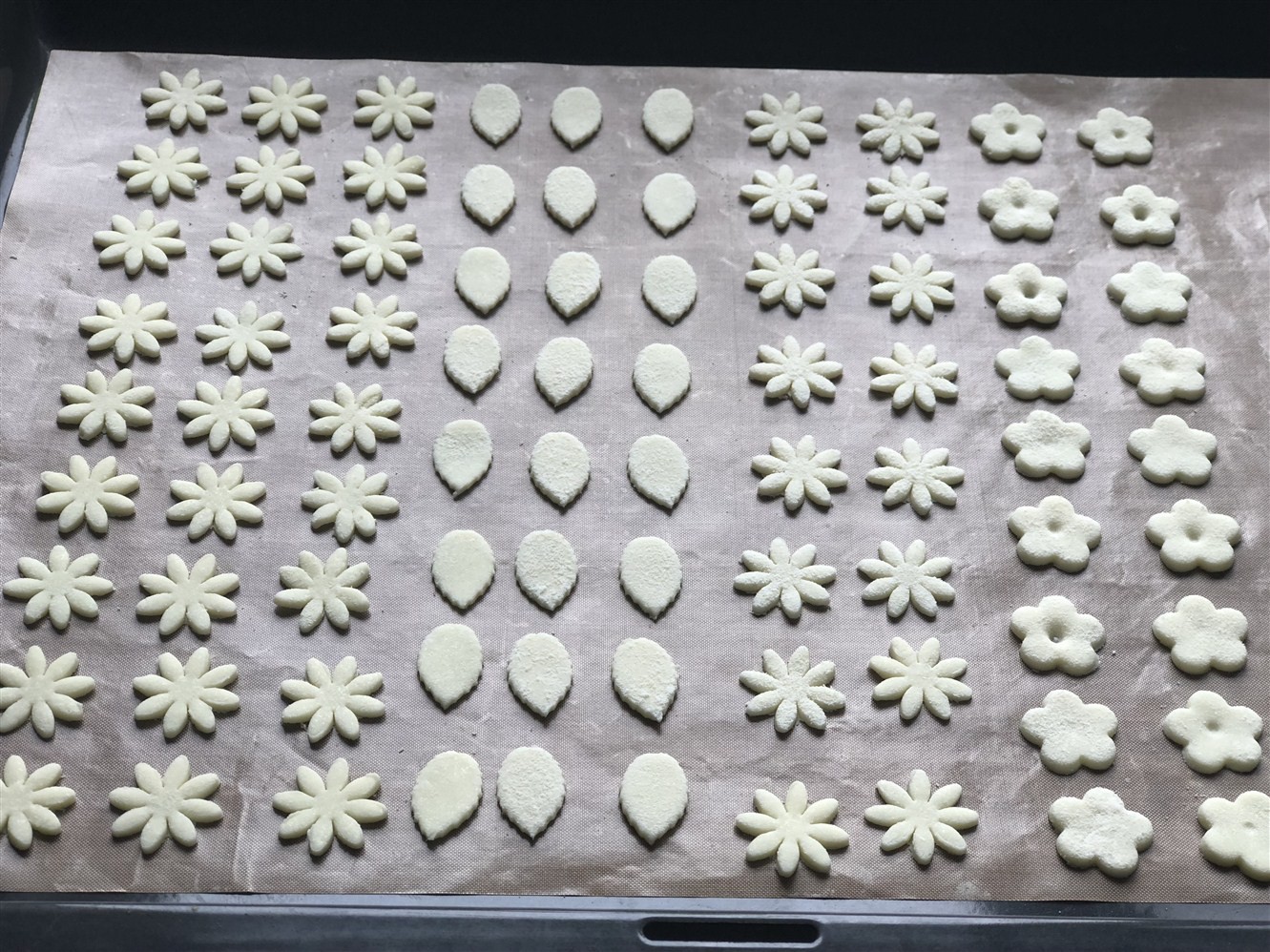 Rắc một ít sữa bột lên mặt phẳng sạch để chống dính. Dùng thanh cán để cán khối bột thành tấm mỏng dày khoảng 2-3mm. Dùng khuôn nhấn cookie để cắt thành từng chiếc bánh.