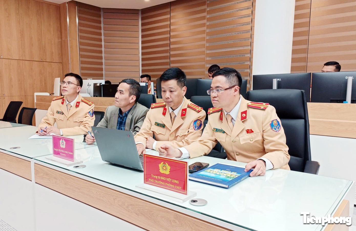 Trung tá Đào Việt Long - Phó trưởng Phòng CSGT Công an TP Hà Nội kiểm tra tại Trung tâm chỉ huy giao thông Hà Nội.