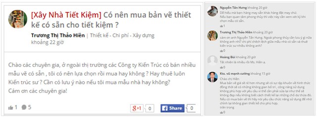 Khi tham gia đặt câu hỏi trên tư vấn xây nhà, bạn sẽ nhận được các tư vấn miễn phí từ các chuyên gia với nhiều góc nhìn thực tế. Các tư vấn thể hiện rất trực quan sinh động bao gồm các hướng dẫn , bí quyết xây nhà , thậm chí đến các bản vẽ kỹ thuật phù hợp với yêu cầu / câu hỏi mà bạn đưa ra.