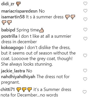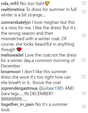 Trang phục của cô đã gặp phải vô số chỉ trích: Quá nhỏ/ Diện váy hè vào mùa đông, thật là lạ đó/ Tôi yêu Meghan, tôi cũng thích chiếc váy nhưng cô ấy đã mặc sai thời điểm và còn chọn nhầm áo khoác nữa/ Cô ấy làm sao có thể thở được trong mẫu váy quá bó như vậy chứ/ Lại còn đi chân trần/ Diện vào mùa xuân thì hợp hơn đó/ Cái váy này không hợp để mặc khi mang bầu…