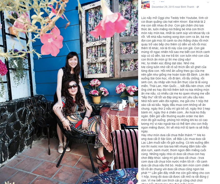 Những dòng tâm sự của chị đã làm lay động bạn bè và những người đọc bởi lẽ nó gợi nhớ đến một người rất quan trọng trong cuộc đời họ: Mẹ. Trong số đó, đồng cảm với chị nhất là những người cũng có con nhỏ, đúng như câu nói “Có nuôi con mới hiểu lòng Cha Mẹ”.