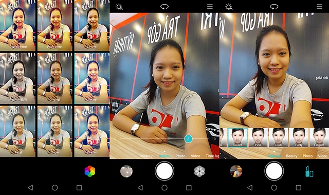 Ứng dụng camera trang bị sẵn nhiều bộ lọc màu đẹp mắt. Bên cạnh đó bạn cũng có thể dùng sẵn các bộ lọc chuyên selfie trong mục Makeup hoặc đơn giản hóa mọi chuyện với chế độ Beauty
