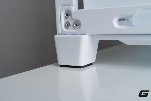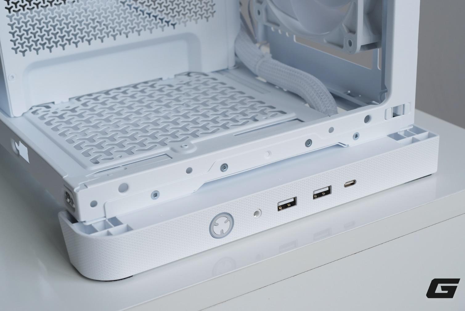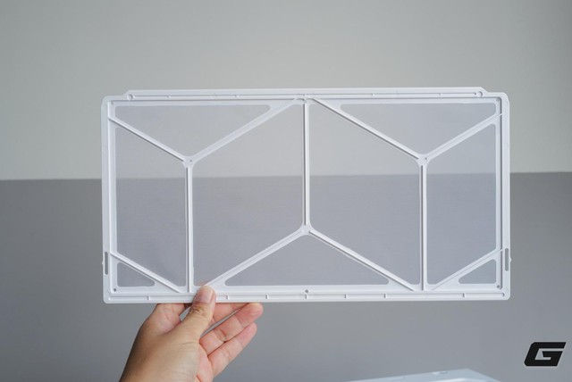 Thiết kế này trông khá tinh tế, nhưng chất liệu nhựa hơi mềm, khiến bề mặt có thể bị lõm nhẹ nếu có tác động mạnh vào. Bù lại, chất liệu này giúp giảm trọng lượng tổng thể của khung máy, đồng thời hạn chế cộng hưởng rung khi quạt hoặc tản nhiệt hoạt động ở tốc độ cao.
