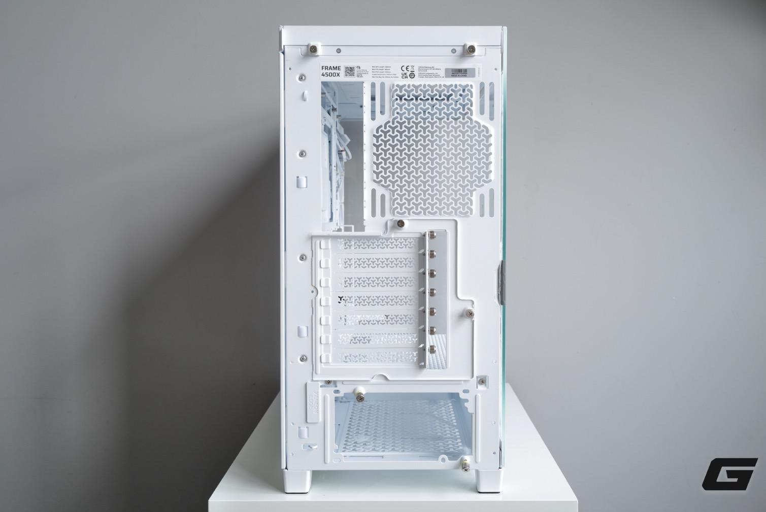 Phía sau, không gian bên trong cho thấy dễ dàng tương thích với mọi chuẩn PSU hiện nay. Phía trên là bảy khe mở rộng xoay được cùng vị trí gắn quạt xả sau; nhờ các khe gắn kéo dài, người dùng có thể tùy chỉnh độ cao quạt thoát khí một cách linh hoạt.