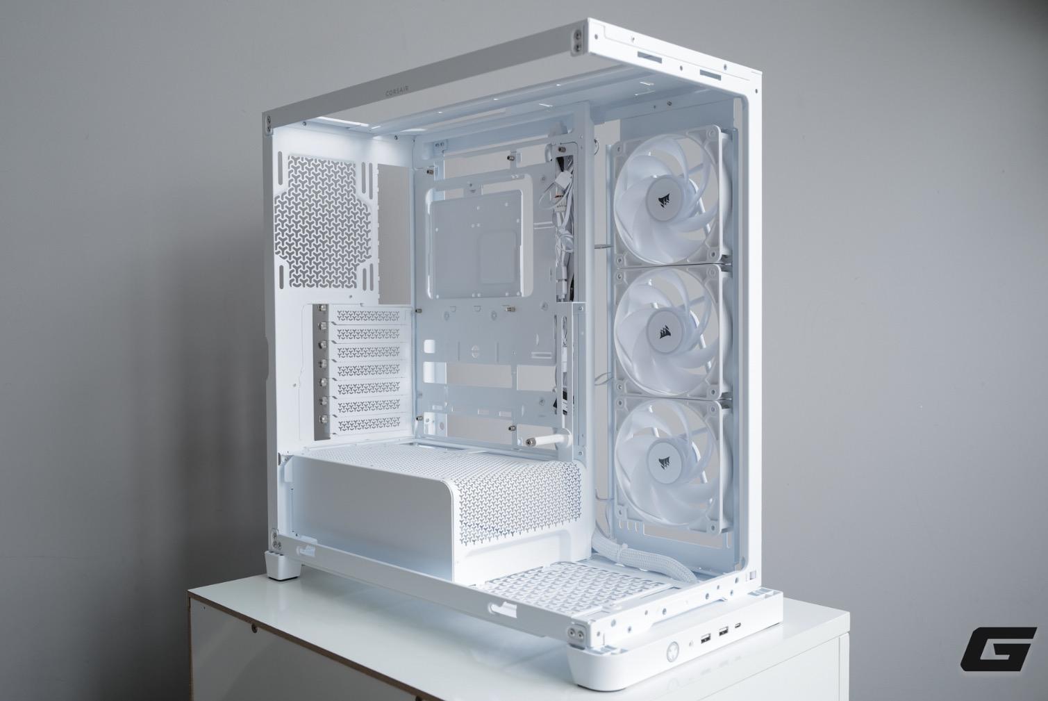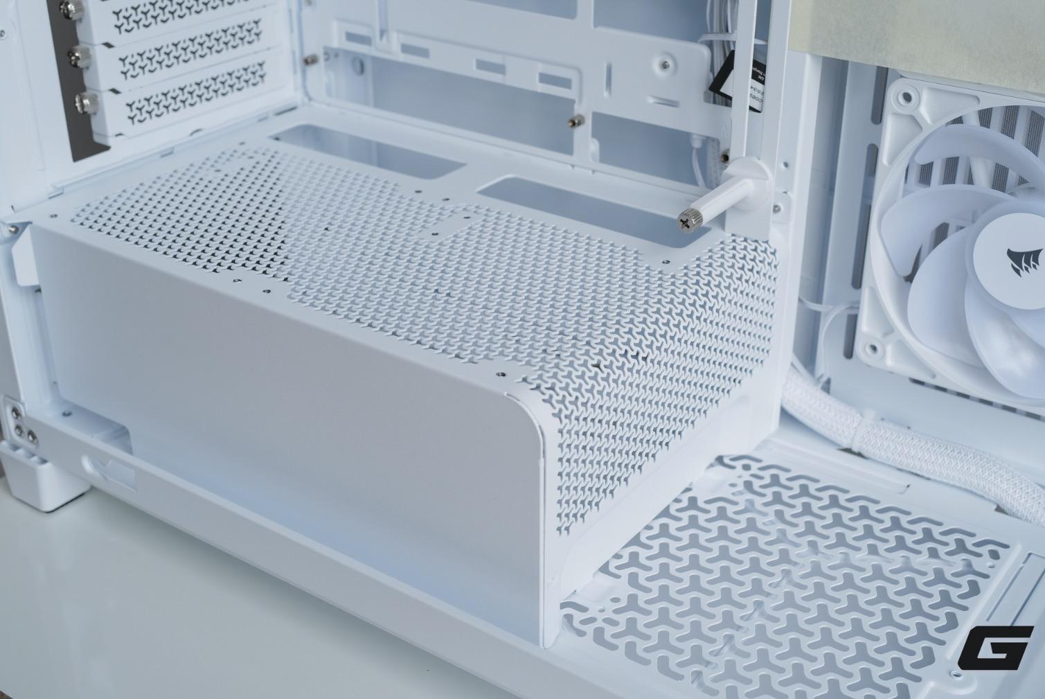 Phần che nguồn bên trong được trang trí với họa tiết thoát khí hình chữ Y đặc trưng, bo tròn ở phía trước để đồng bộ với phong cách bo góc tổng thể. Corsair có bố trí lỗ gắn hai quạt bổ sung, giúp hút gió gián tiếp vào khoang trong.
