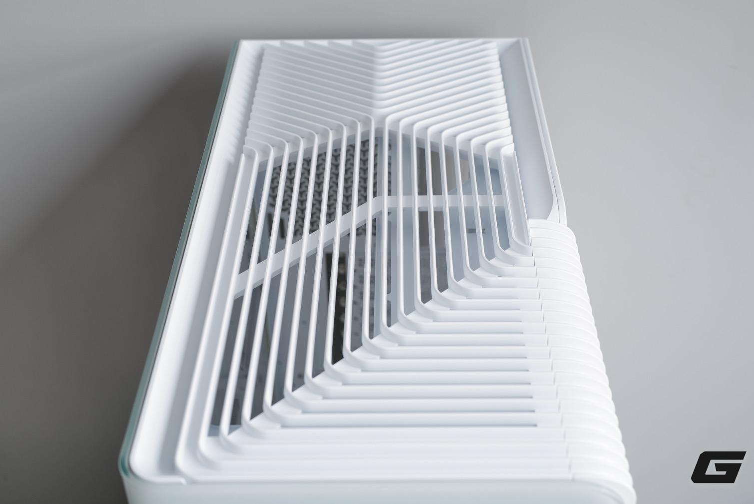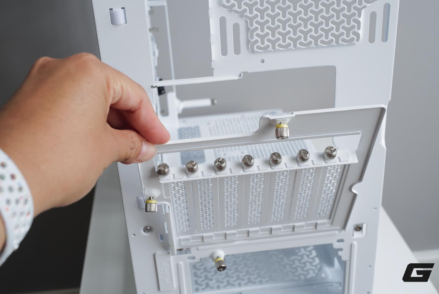 Ngay phía trên là bảy slot mở rộng nằm trong khung riêng có thể xoay được, mang lại sự linh hoạt khi lắp card đồ họa (theo chiều đứng hoặc ngang) hoặc phụ kiện. Lưới dạng chữ Y phía trên hỗ trợ một quạt 120 mm hoặc 140 mm.