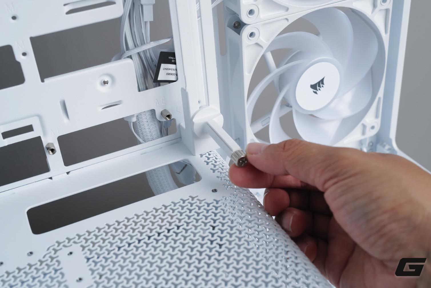 Ở mặt đối diện, Corsair chia khung bên thành hai phần riêng biệt. Nửa sau là tấm kim loại liền khối, cố định bằng chốt nhấn. Nửa còn lại là mảng nhựa thoát khí, nối liền với phần thông gió phía trên đỉnh case.
