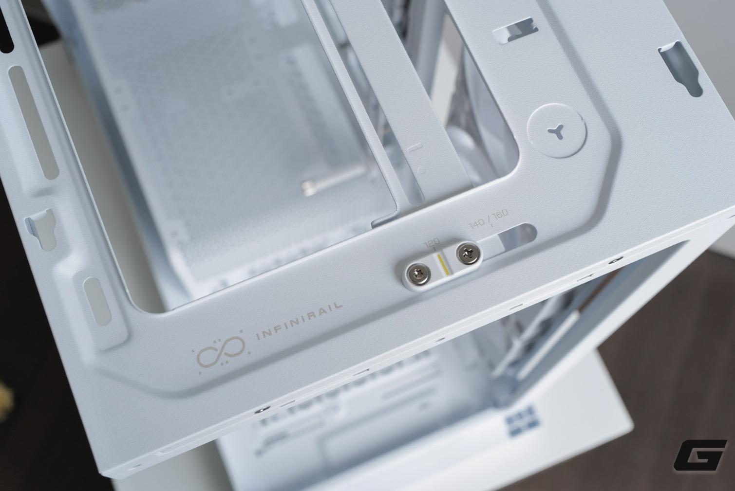 Nhìn lên khu vực nóc máy, đây là vị trí lý tưởng để gắn tản nhiệt AIO, với khoảng cách rộng giữa thanh gắn và khu vực mainboard. Corsair tiếp tục sử dụng hệ thống Infinirail, đồng thời có một khe có thể tháo rời, cho phép người dùng tùy biến cổng khi lắp tản nhiệt nước custom.