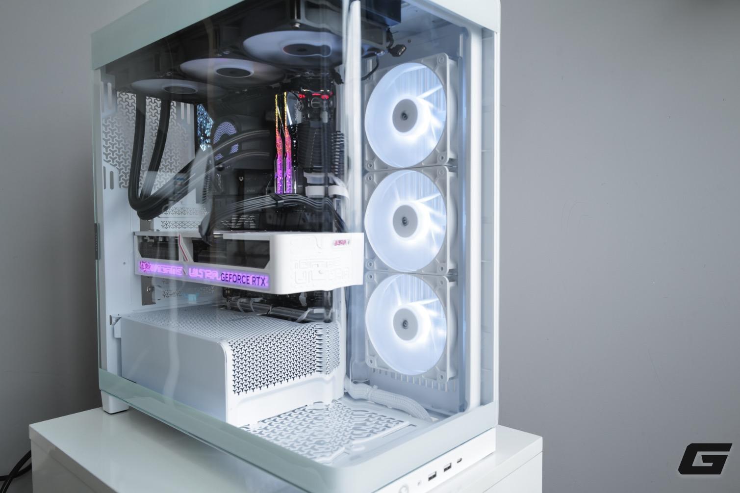 Từ góc nhìn chính diện, có thể quan sát xuyên suốt đến tận mặt sau của khung máy, mang lại không gian trưng bày linh kiện đầy ấn tượng.