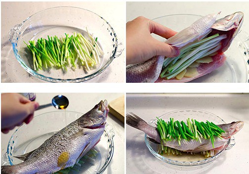 Cá mua về rửa sạch, để ráo nước hoàn toàn. Hành lá cắt khúc dài 6cm, gừng thái lát mỏng. Trong 1 tô thủy tinh chịu nhiệt, xếp 1 ít hành lá xong lòng tô. Cho vào trong bụng cá một ít gừng thái lát và hành lá. Sau đó đặt cá lên trên phần hành xếp trong tô, rưới dầu mè lên trên. Tiếp theo lại xếp 1 lượt hành lá lên trên cá.