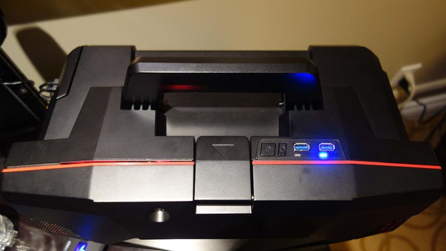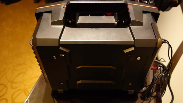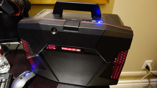 Tại CES 2014 đang diễn ra, hãng CyberPowerPC vừa giới thiệu một chiếc máy tính có thiết kế không giống ai có tên Fang Battle Box. Đây là chiếc máy tính có cấu hình cực khủng và nó được tối ưu cho giới game thủ phải thường xuyên di chuyển, nhờ thiết kế có quai xách như 1 chiếc vali. Bạn cũng có thể đặt ngang cặp xuống và mở ra như 1 chiếc vali thông thường để xem linh kiện bên trong. Như chúng ta có thể thấy, máy khá nhỏ gọn và được trang trí các đèn LED rất bắt mắt.