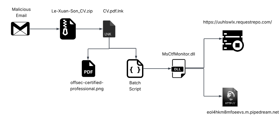 Chuỗi tấn công được thiết kế theo ba giai đoạn chặt chẽ để tránh bị phát hiện. Giai đoạn đầu tiên bắt đầu khi nạn nhân mở file CV, nó sẽ hiển thị bản CV giả trên màn hình để đánh lừa trong khi ở phía sau, mã độc ẩn đang được kích hoạt.