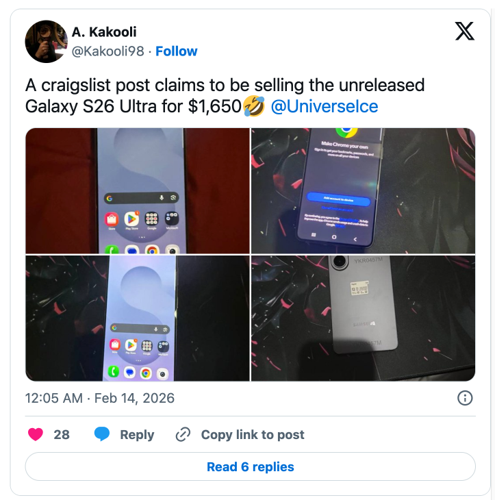 Theo thông tin lan truyền, một chiếc máy được quảng cáo là Galaxy S26 Ultra đã bị rao bán trên Craigslist. Các hình ảnh sau đó được chia sẻ lại trên nền tảng X. Tuy nhiên, chưa có xác nhận độc lập về việc thiết bị này thực sự được rao bán với giá 1.650 USD, tương đương khoảng 42,8 triệu đồng.