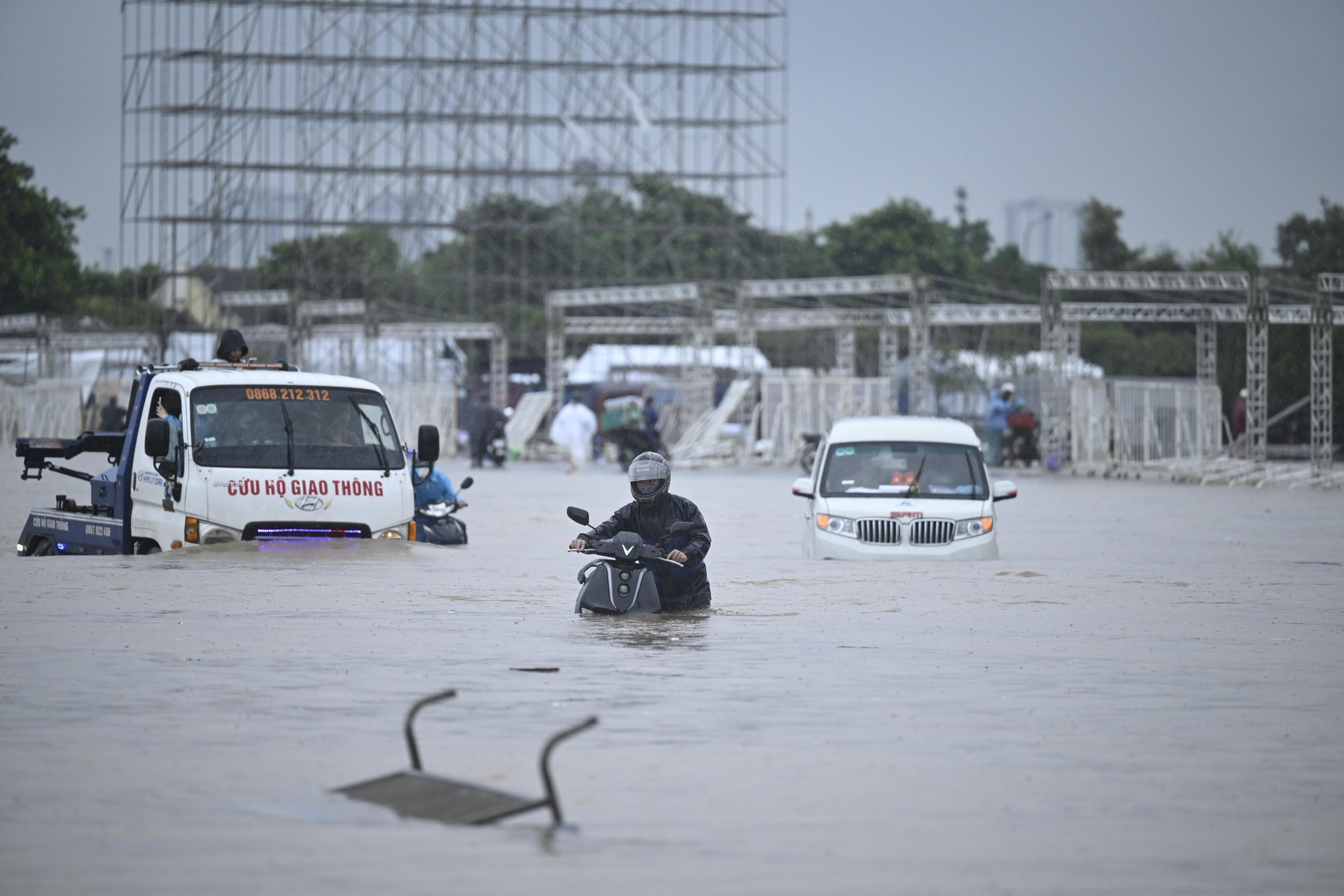 Nhiều tuyến đường quanh khu vực đều rơi vào tình trạng ngập sâu, xe máy chết máy hàng loạt, người dân buộc phải dắt bộ hoặc bì bõm lội nước để kịp giờ làm. Ngoài cách lội nước, một số người tận dụng vật dụng như phao bơi, xuồng tự chế hay thậm chí là bơi để di chuyển qua đoạn ngập.