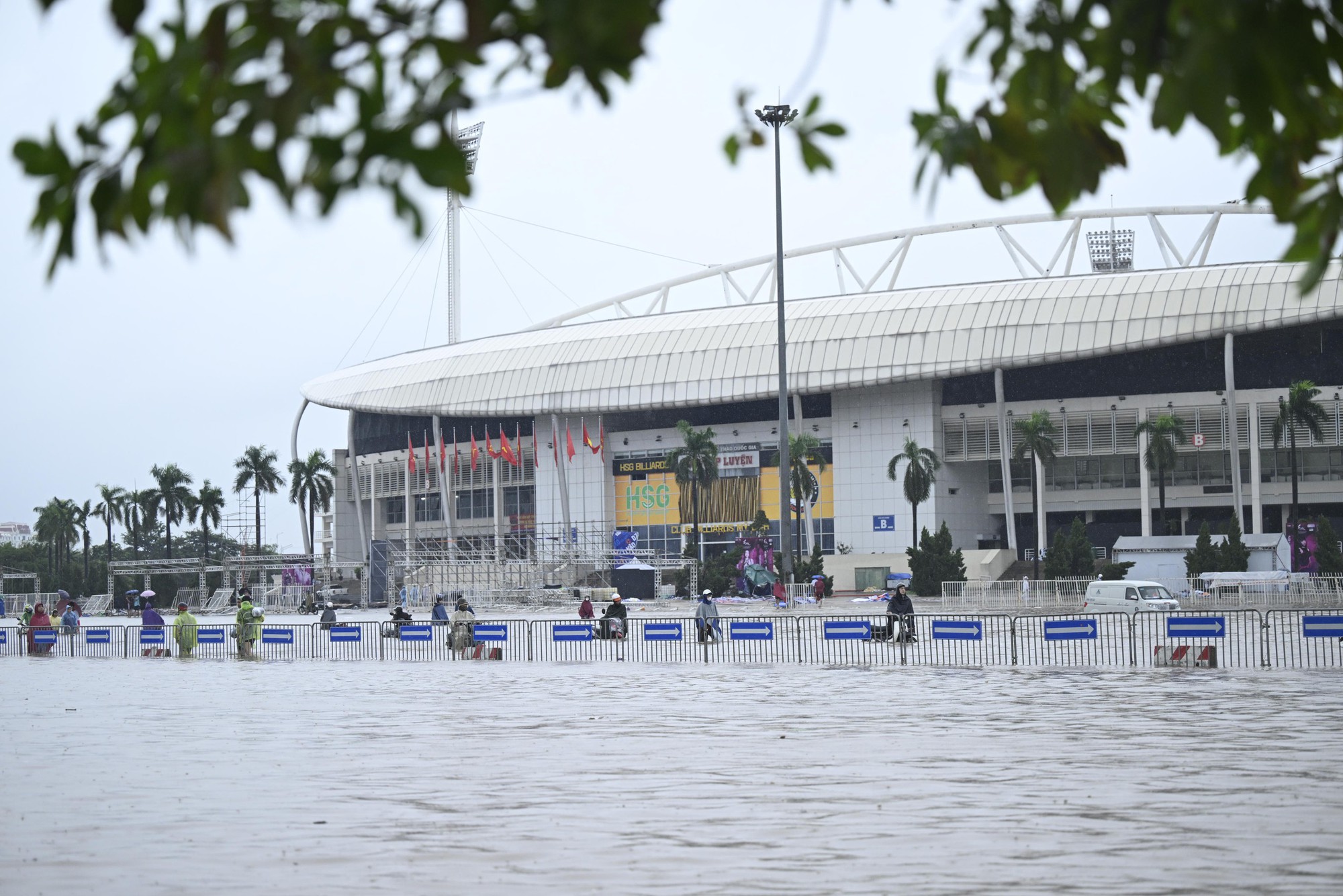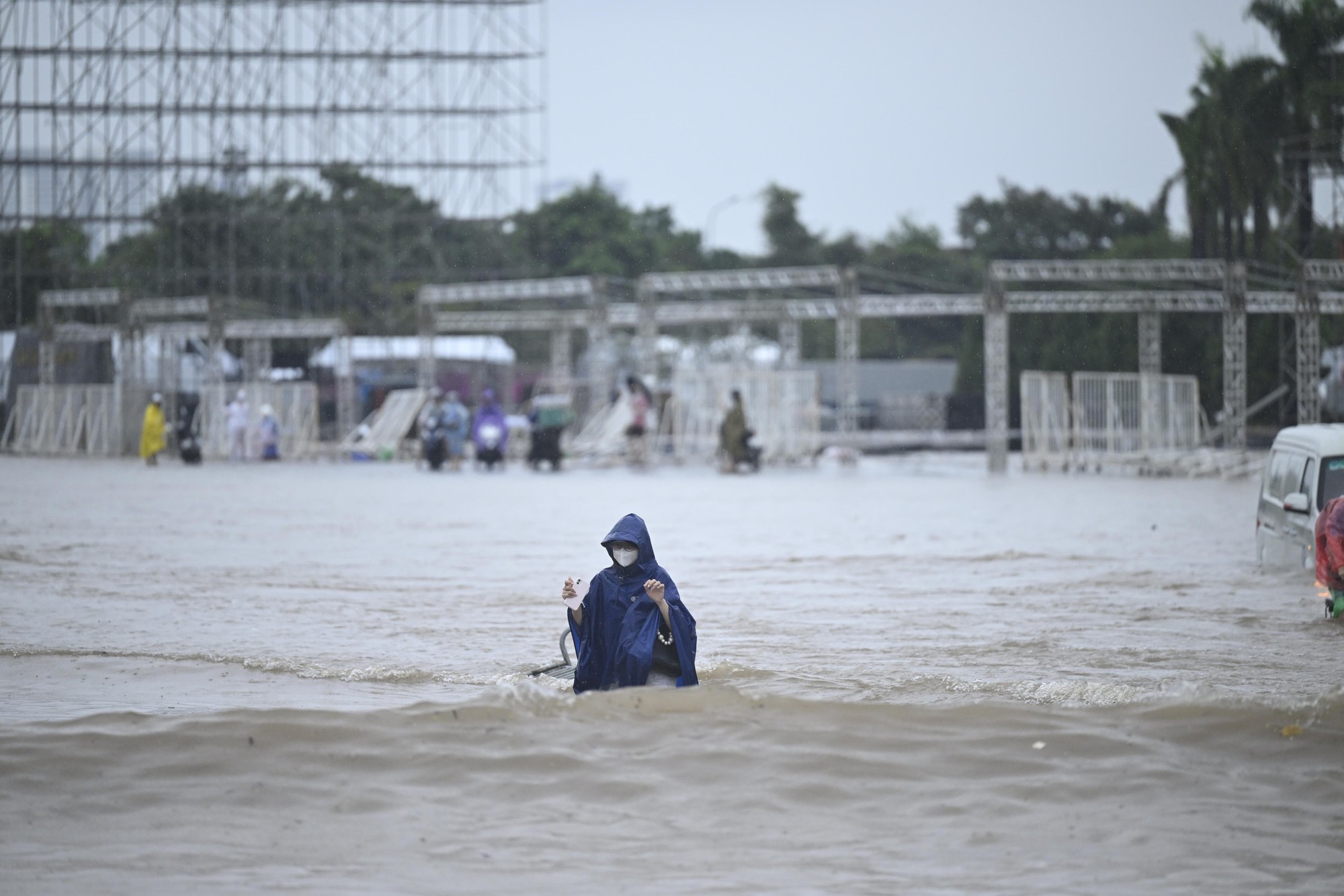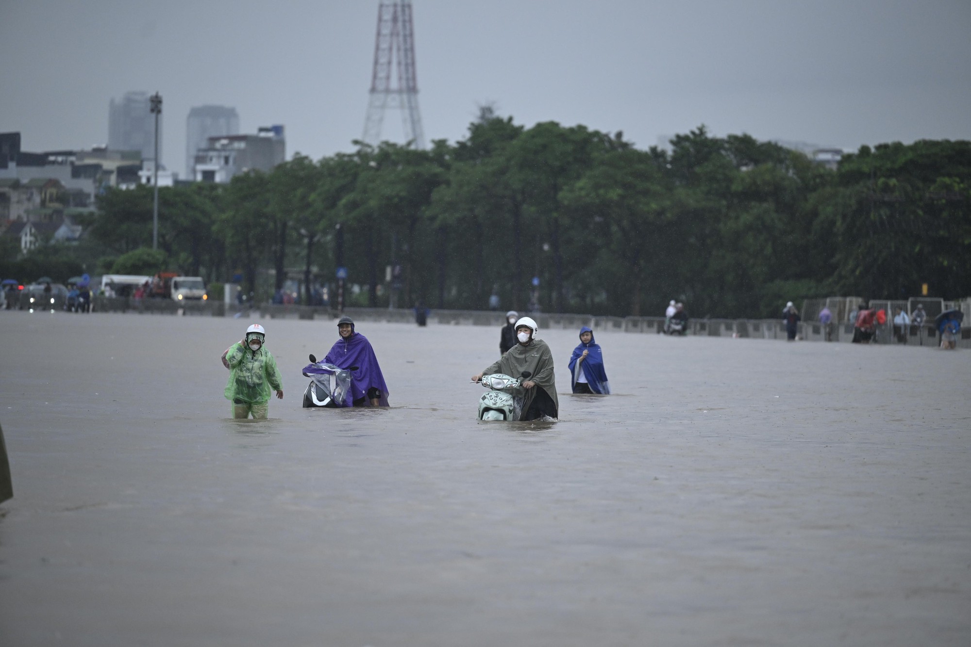 Theo ghi nhận, từ rạng sáng, khu vực quanh sân vận động Mỹ Đình (quận Nam Từ Liêm) - một trong những “điểm nóng” ngập úng - đã chìm trong biển nước. Cả vùng ngập mênh mông, nước dâng cao đến ngang hông người lớn, gió thổi mạnh kèm mưa lớn khiến khu vực này chẳng khác nào một vùng biển giữa lòng Thủ đô.