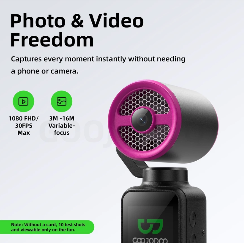 Thiết bị này có khả năng quay video ở mức tối đa 1080p 30fps, sử dụng cảm biến CMOS và lưu trữ qua thẻ nhớ TF, hỗ trợ dung lượng lên đến 128GB. Người dùng có thể xem lại nội dung ngay trên màn hình tích hợp mà không cần kết nối thiết bị ngoài. Máy vẫn có thể lưu một số ảnh thử khi chưa lắp thẻ nhớ, nhưng chỉ xem được trực tiếp trên thiết bị. Ngoài ra, nhà sản xuất cho biết mẫu quạt này có thể kết nối với máy tính dùng làm webcam qua cáp USB-C.
