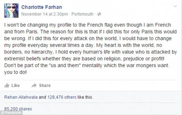 Sau vụ khủng bố liên hoàn xảy ra tại Paris, Pháp hôm 13/11 vừa qua, cộng đồng mạng trên khắp thế giới đã thực hiện nhiều cách để thể hiện sự quan tâm và cảm thông với người dân nước này và đổi avatar trên mạng xã hội là một trong số đó. Tuy nhiên, một cô gái Pháp có tên Charlotte Farhan lại bất ngờ từ chối đổi avatar quốc kỳ Pháp vì điều này "không đúng đắn". Đoạn trạng thái của cô được cộng đồng mạng hưởng ứng nhiệt tình với hơn 128.000 lượt nhấn thích.