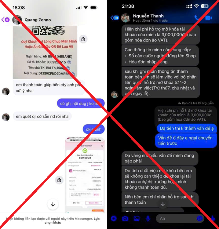 Hình ảnh các đối tượng yêu cầu nạn nhân chuyển khoản để tiến hành mở khóa tài khoản, sau đó chặn liên hệ