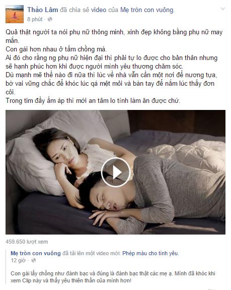 Rất nhiều các mẹ đã tìm thấy mình trong đoạn phim ngắn này. Có những giọt nước mắt. có sự đồng cảm và cả sự tức giận… Nick facebook Thúy Nguyễn chia sẻ: “Xem xong mà nước mắt cứ tuôn. Ước gì mình được như thế này…” hay chia sẻ của nick Thảo Lâm: “Qủa thật người ta nói phụ nữ thông mình xinh đẹp không bằng phụ nữ may mắn. Con gái hơn nhau ở tấm chồng mà”… và còn rất nhiều những cảm xúc khác từ các ông bố bà mẹ, những người đang trong cuộc sống hôn nhân hay những người sắp kết hôn.