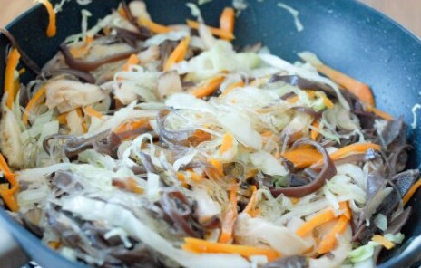 Nấm hương ngâm nở thái nhỏ. Mộc nhĩ ngâm nở, thái sợi. Bắp cải thái sợ, cà rốt thái sợi. Miến ngâm cho mềm, để ráo nước rồi cắt nhỏ. Cho tất cả nguyên liệu vào xào sơ, cho 2 thìa cafe nước tương vào xào cùng.