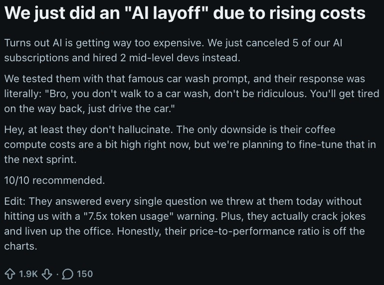 Chủ nhân bài viết chia sẻ về một quyết định mới của công ty: họ vừa hủy 5 gói đăng ký AI trả phí để lấy ngân sách tuyển dụng hai lập trình viên bậc trung (mid-level dev).