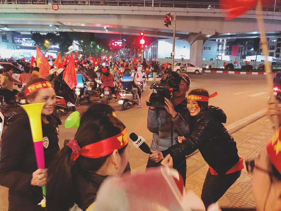 Cô chọn cách nâng cao tình cảm với ông xã bằng cách cùng nhau đưa con "đi bão" mừng chiến thắng của đội tuyển Việt Nam.