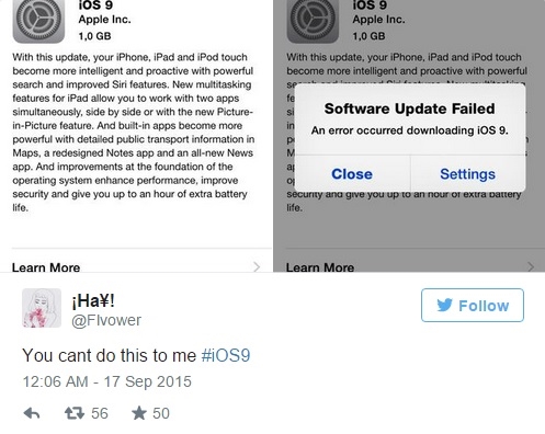 Theo đó, khi tiến hành nâng cấp lên iOS 9 qua giao thức trực tiếp OTA (nâng cấp qua ứng dụng Settings>General>Software Update trên iPhone/iPad), hệ thống đưa ra thông báo lỗi cho biết việc cập nhật bị thất bại (Software Update Failed). Apple cũng đưa ra thông báo rõ ràng rằng "có lỗi xảy ra khi tải về iOS 9" (An error occurred downloading iOS 9).