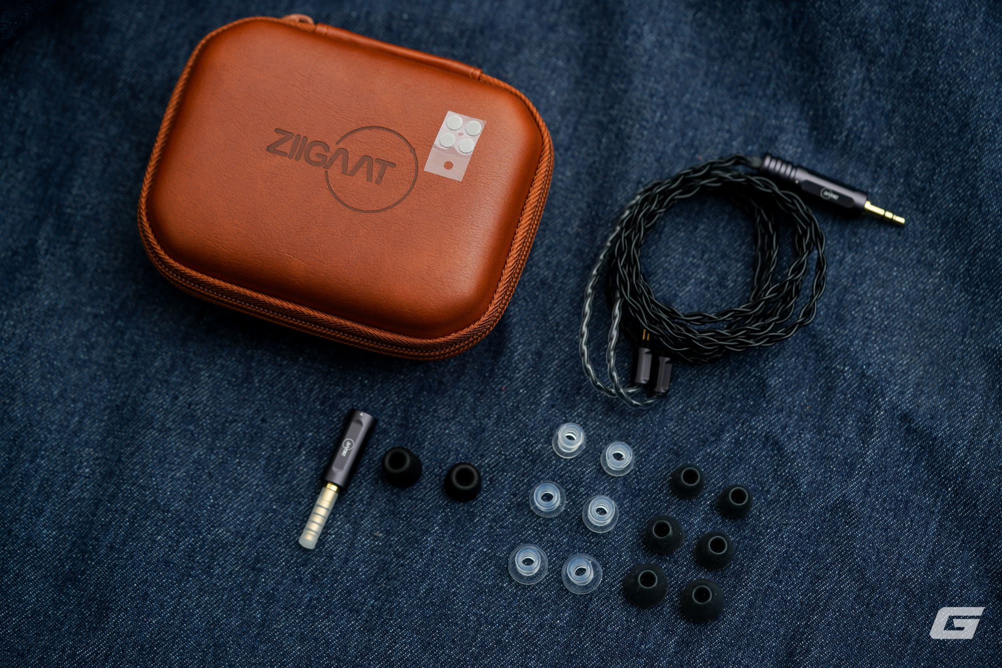 Mở hộp, ta có bộ phụ kiện thế hệ mới của ZiiGaat bao gồm một hộp da lớn, sợi dây kết nối, 6 bộ tips cao su mềm (loại có bề mặt dính) và một bộ tips bọt biển.
