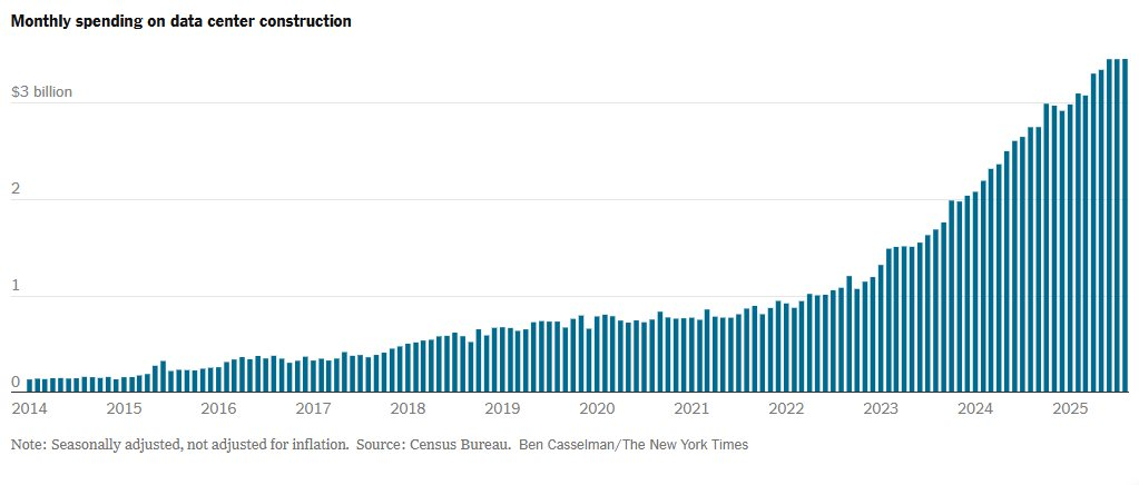 Ngành xây dựng truyền thống đang chịu ảnh hưởng nặng nề từ lãi suất cao và thuế quan. Chi tiêu xây dựng phi nhà ở giảm liên tục, trong khi xây dựng nhà ở vẫn thấp hơn mức đỉnh thời kỳ đại dịch. Ngược lại, xây dựng trung tâm dữ liệu và cơ sở hạ tầng liên quan vẫn tăng trưởng mạnh, đóng vai trò trụ cột hiếm hoi kéo nền kinh tế ngoài lĩnh vực công nghệ.