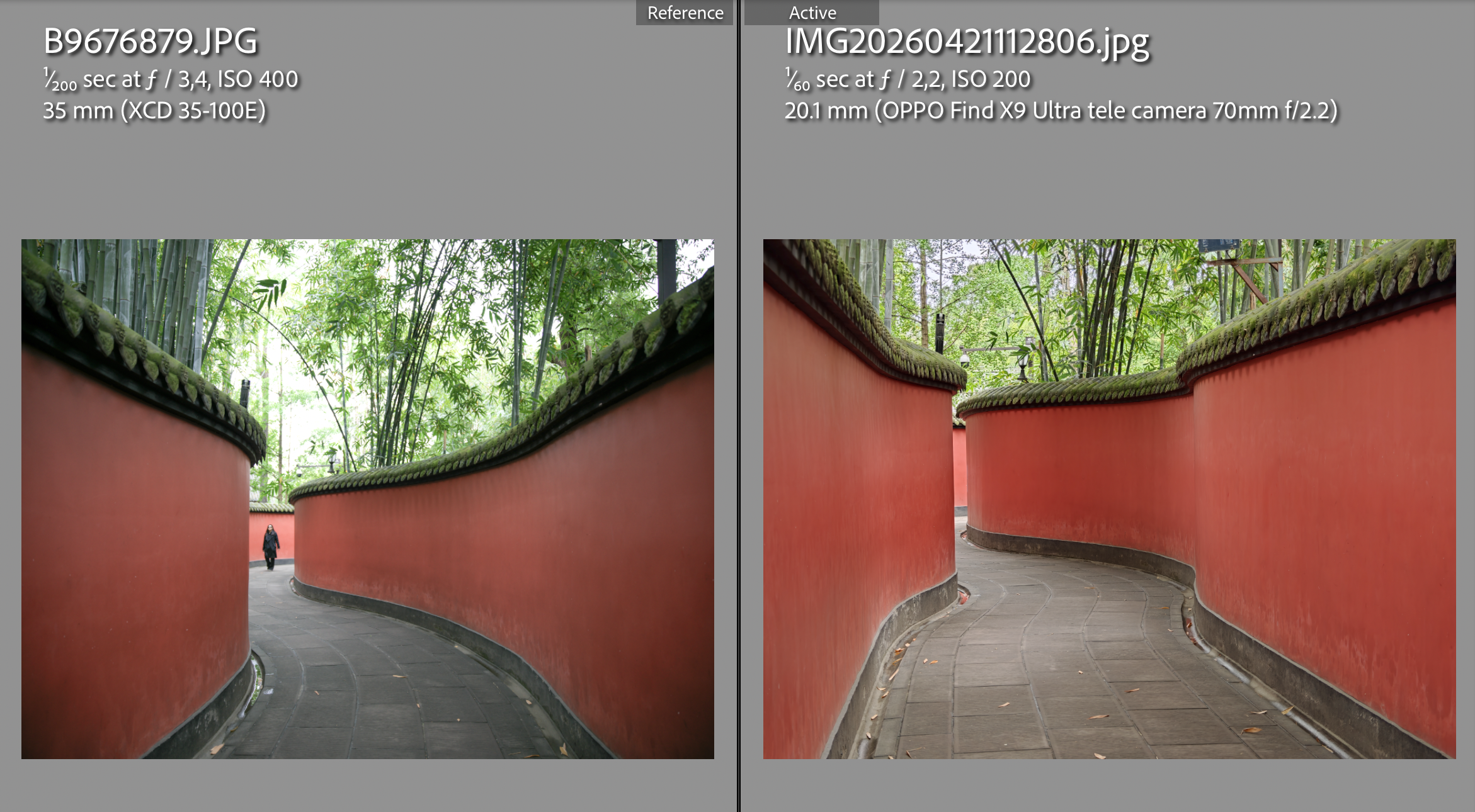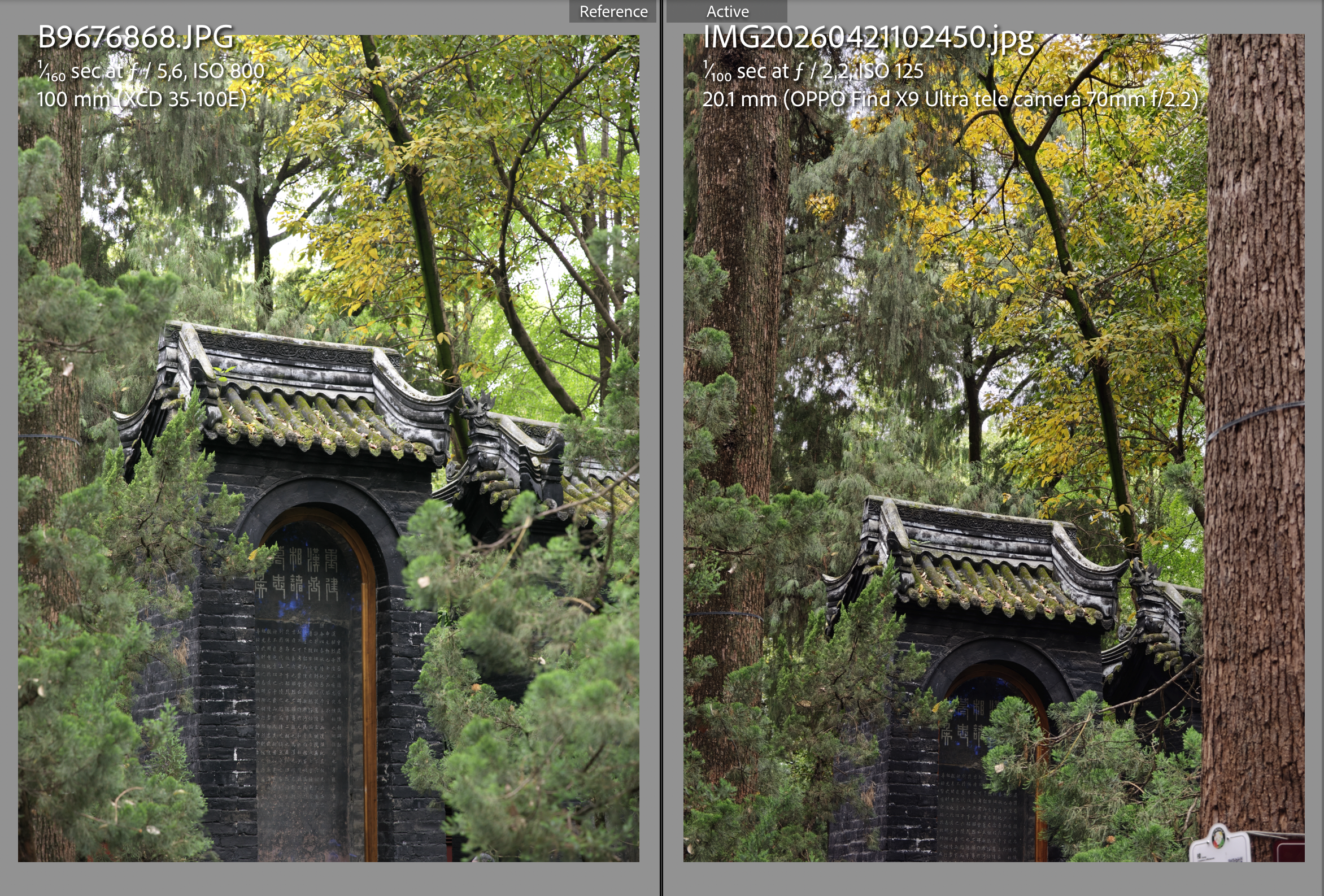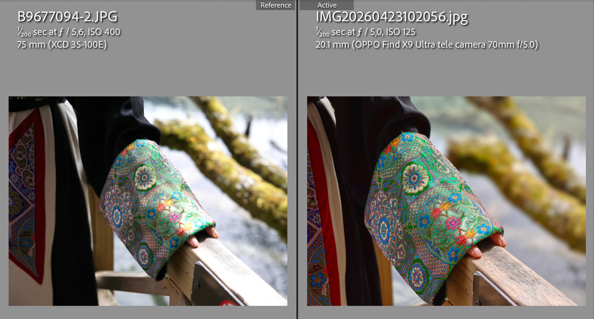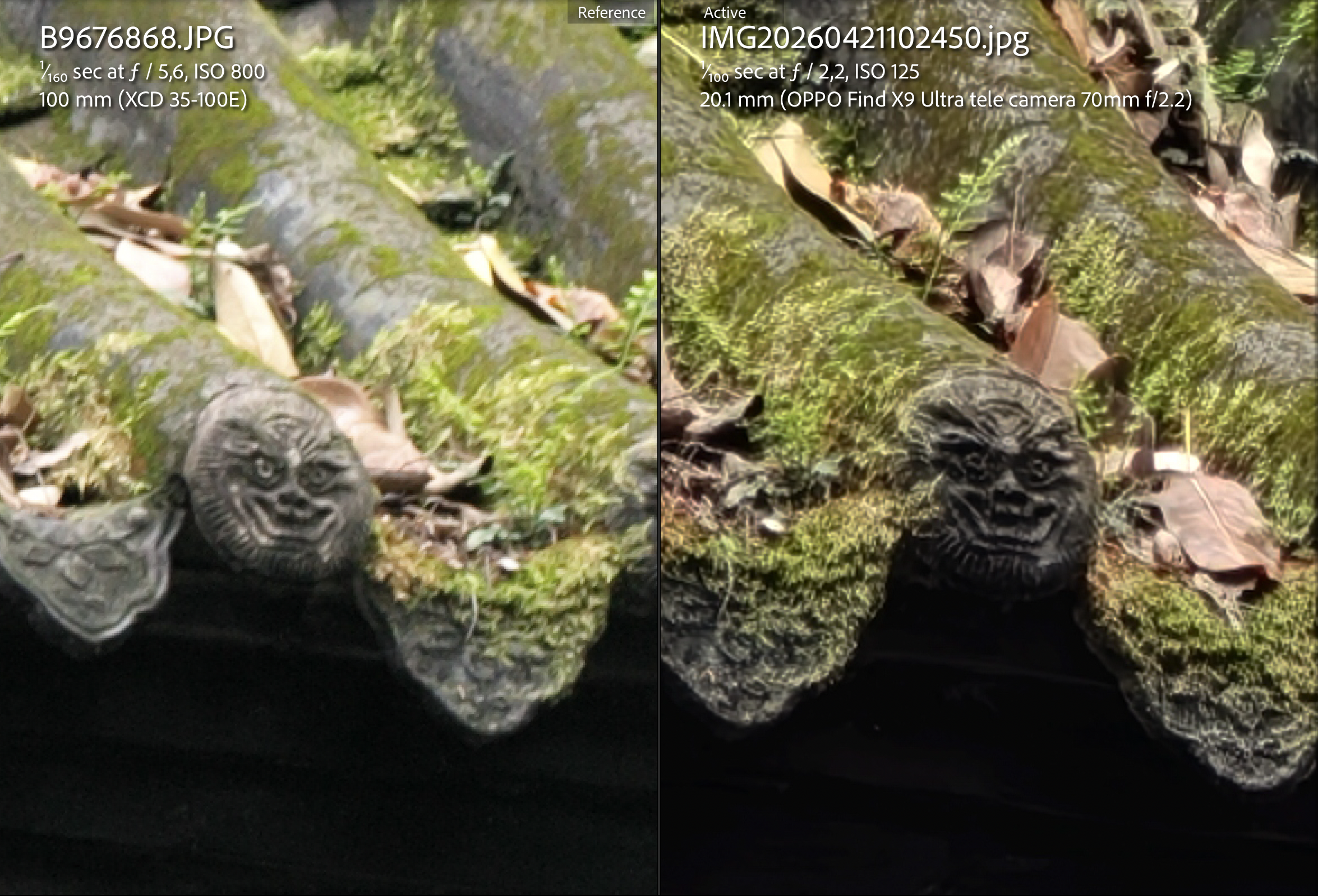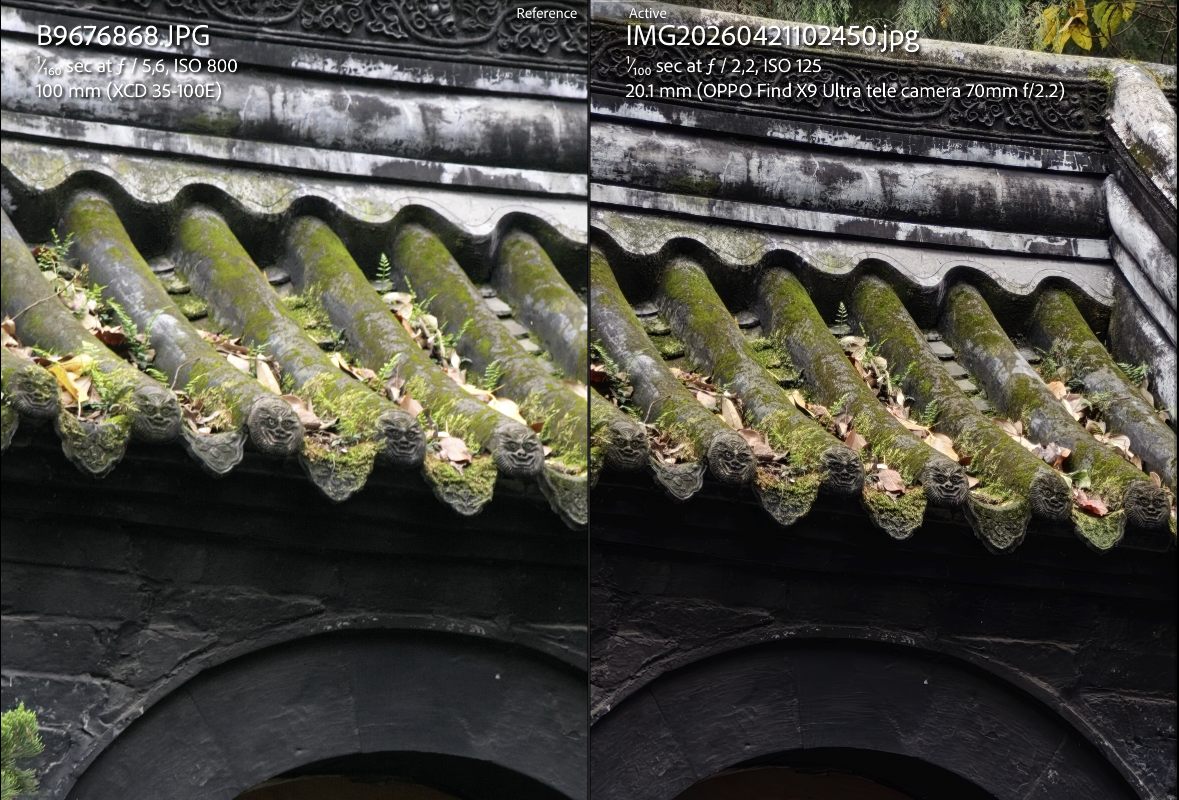 Về mặt tổng quan, OPPO Find X9 Ultra ở chế độ Hi-res 200MP zoom 3X (bên phải) cho màu sắc cũng khá giống với Hasselblad X1D II (bên trái). Lưu ý rằng những bức ảnh tôi so sánh trong bài này đều không qua hậu kỳ để có sự nhận xét chuẩn chỉnh nhất.