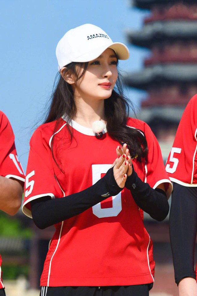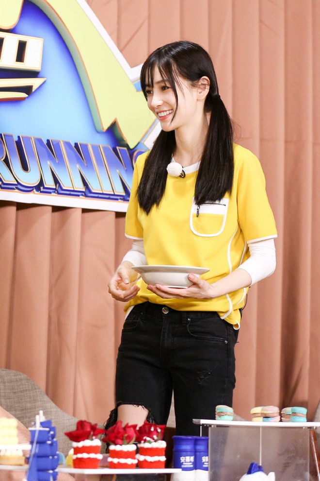 Angela Baby từng nhiều lần diện áo dài tay bên trong áo tshirt để tránh nắng khi tham dự show Running Man bản Trung.